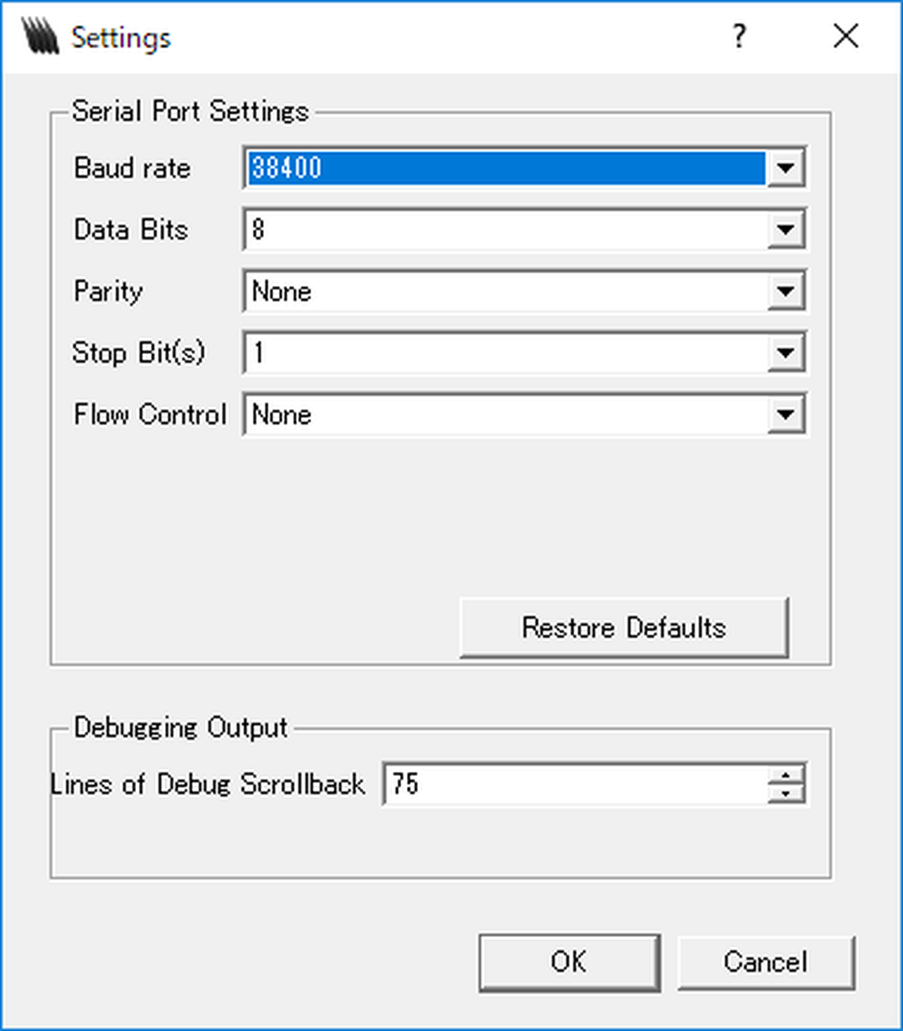 Baud rateを先ほどコードで指定した38400にしてOKを押します。
