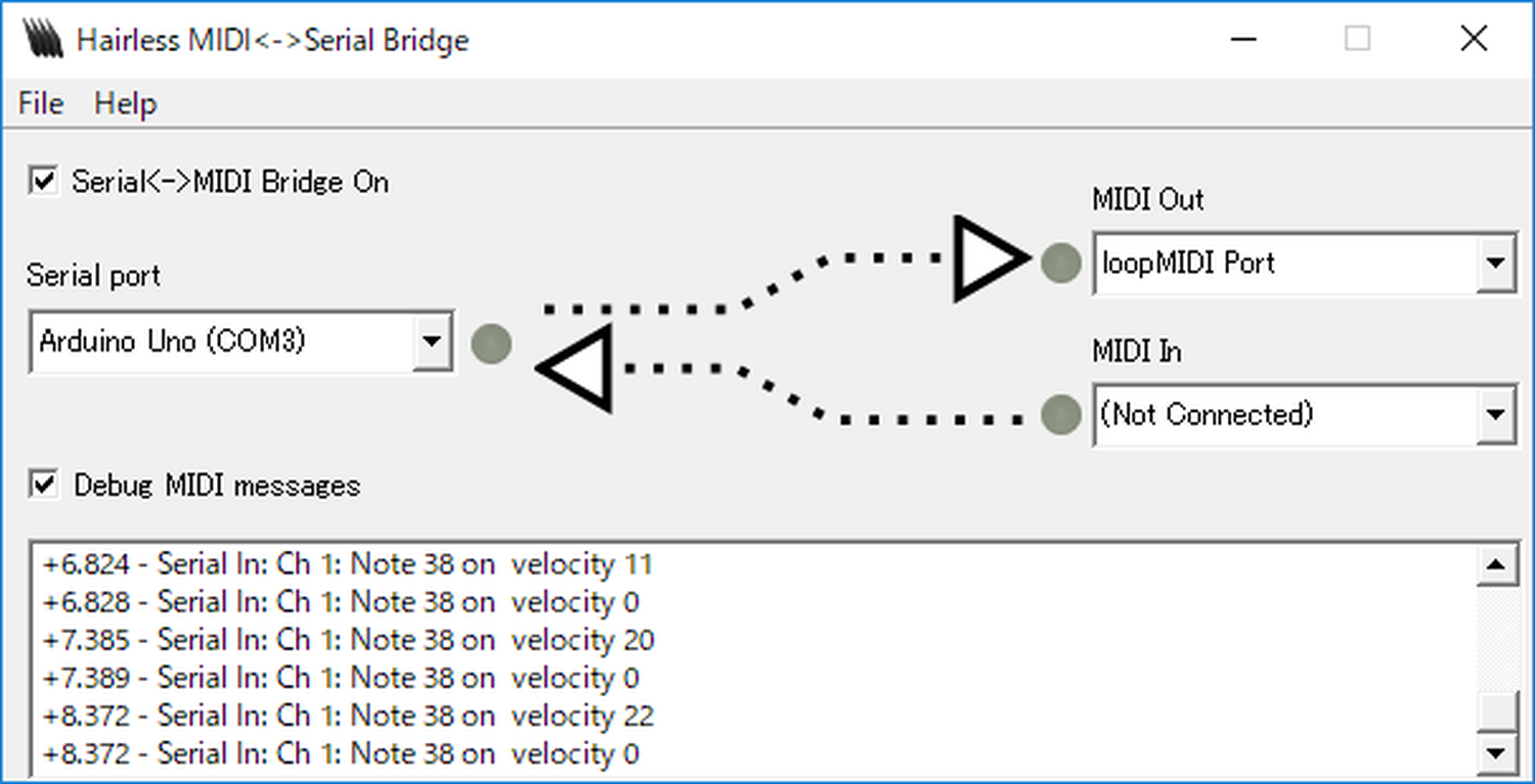 Serial portでarduinoを選択して、MIDI outでloopMIDIを選択します。