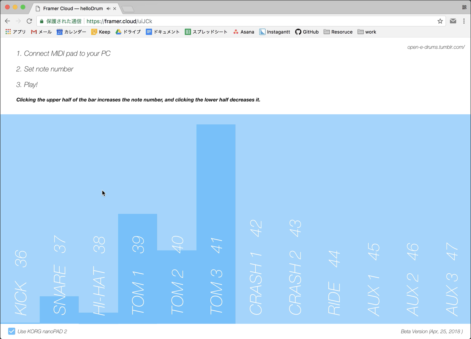反応しない場合はchormeを一旦終了して、MIDIコントローラーを繋いだ状態でchromeを起動してみてください。