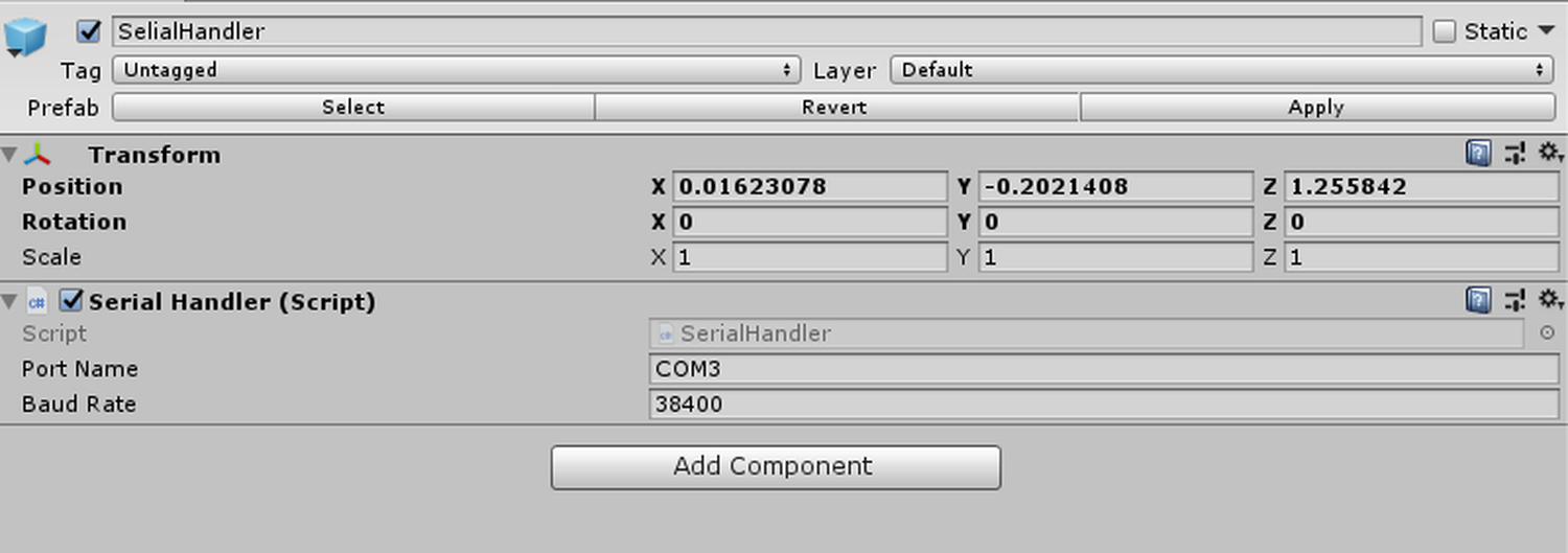 SerialHandlerのInspectorでポートとボーレートを指定します。
