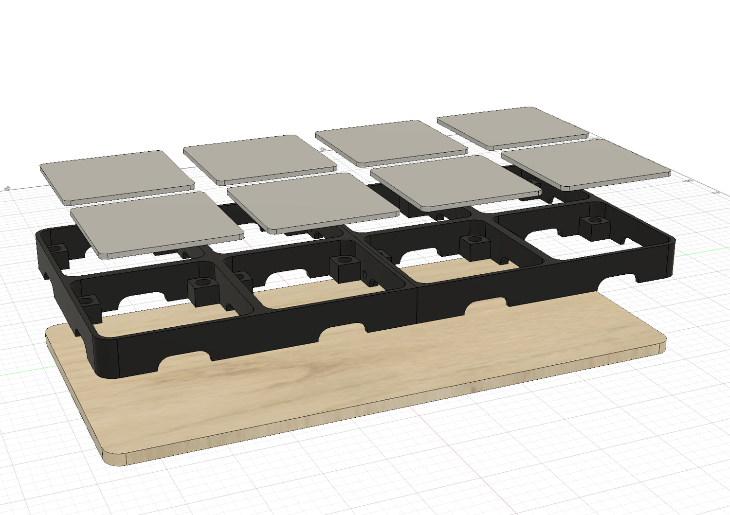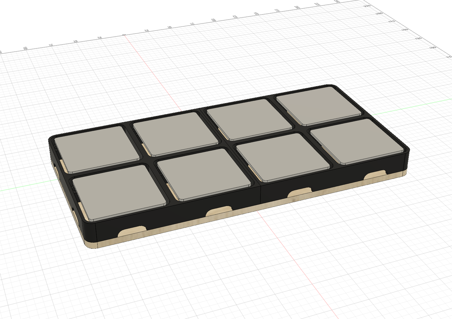 ピエゾ同士が近いのでパッドとなるプレートは独立しています。配線は作りながら考えようと思ってたので側面に抜け道をたくさん作ってます。底面はなにか適当な板材を使うので固定用に至る所にネジ用穴開けてます。