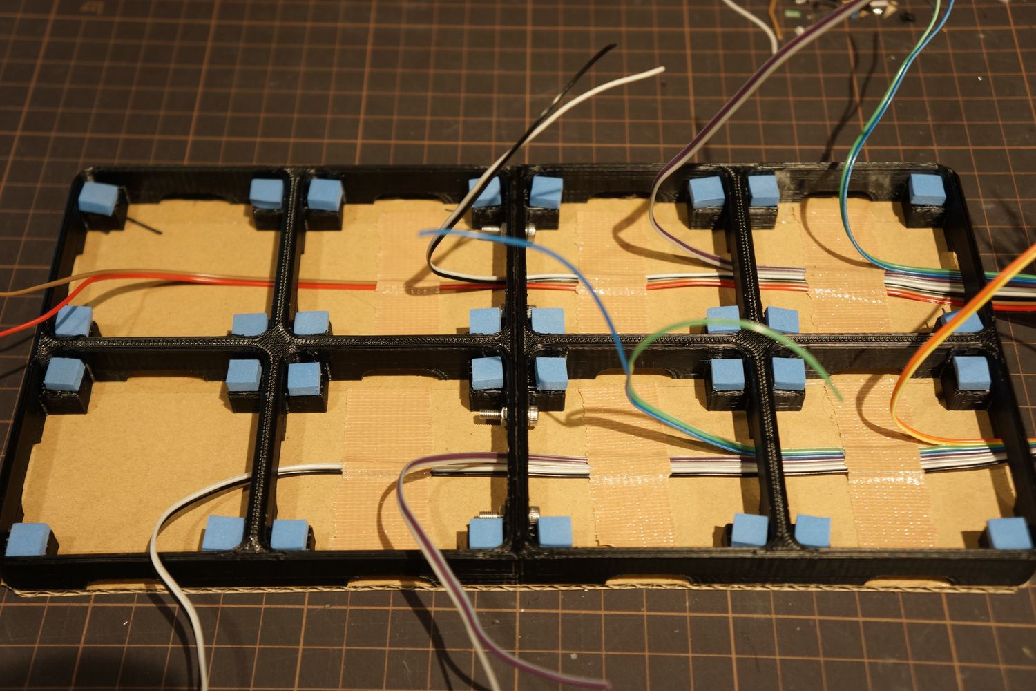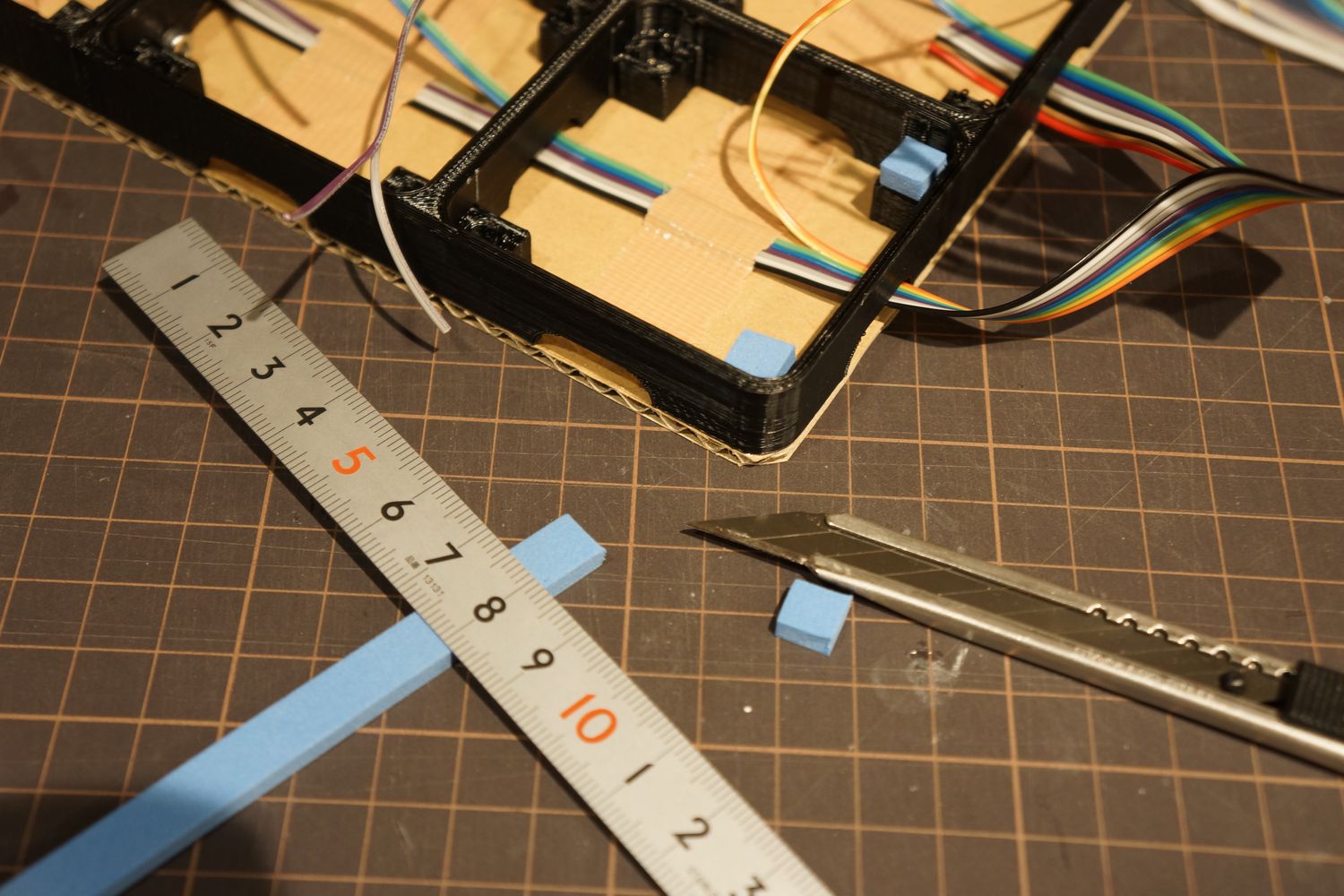 プレートとフレームが直接ふれないようにEVAフォームを挟みます。100円ショップで売ってた3mm厚のものです。カッターで細かく切ってグルーガンでくっつけました。