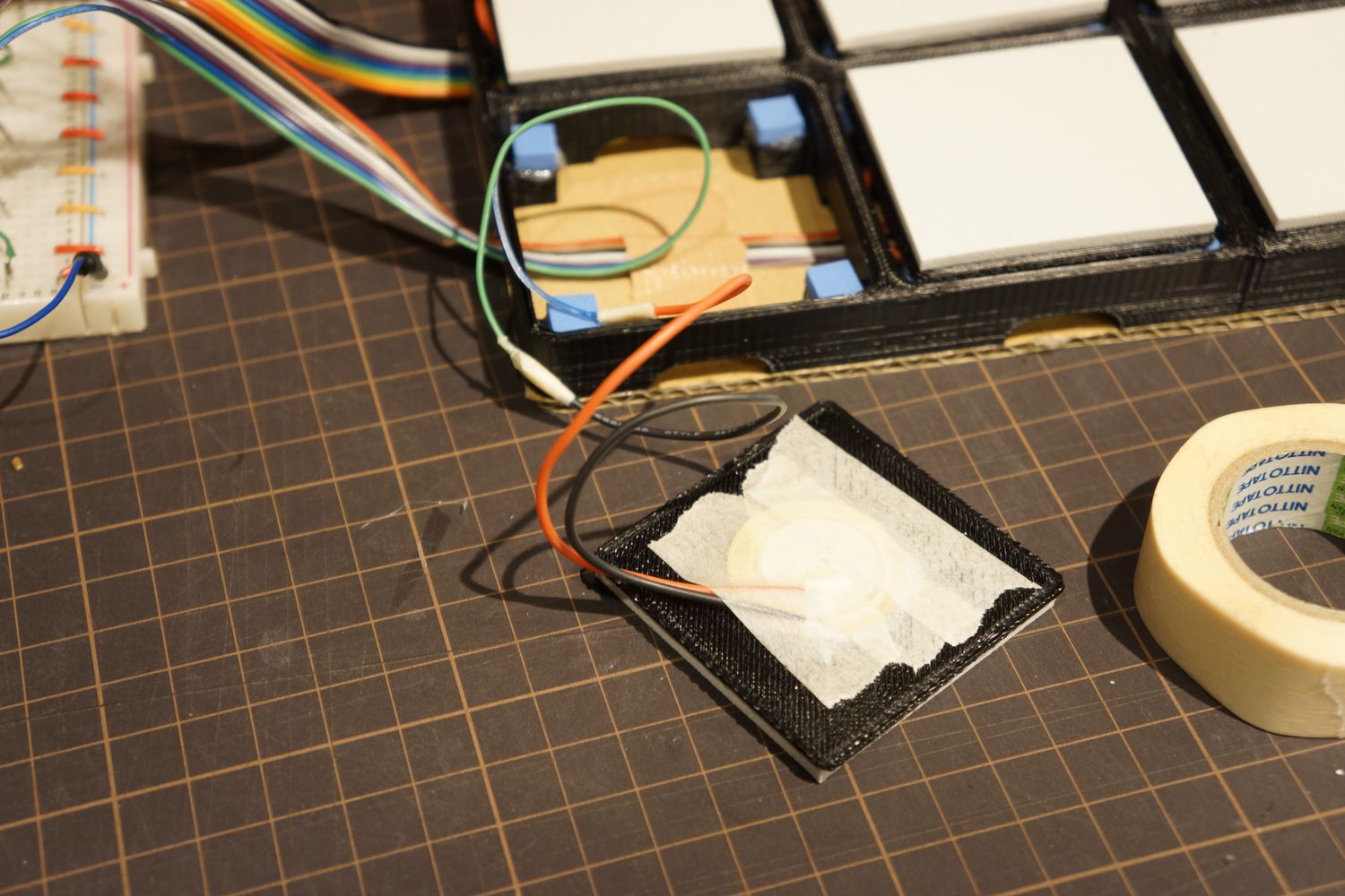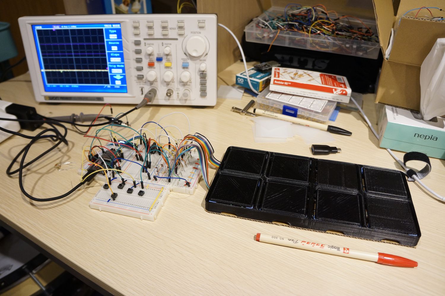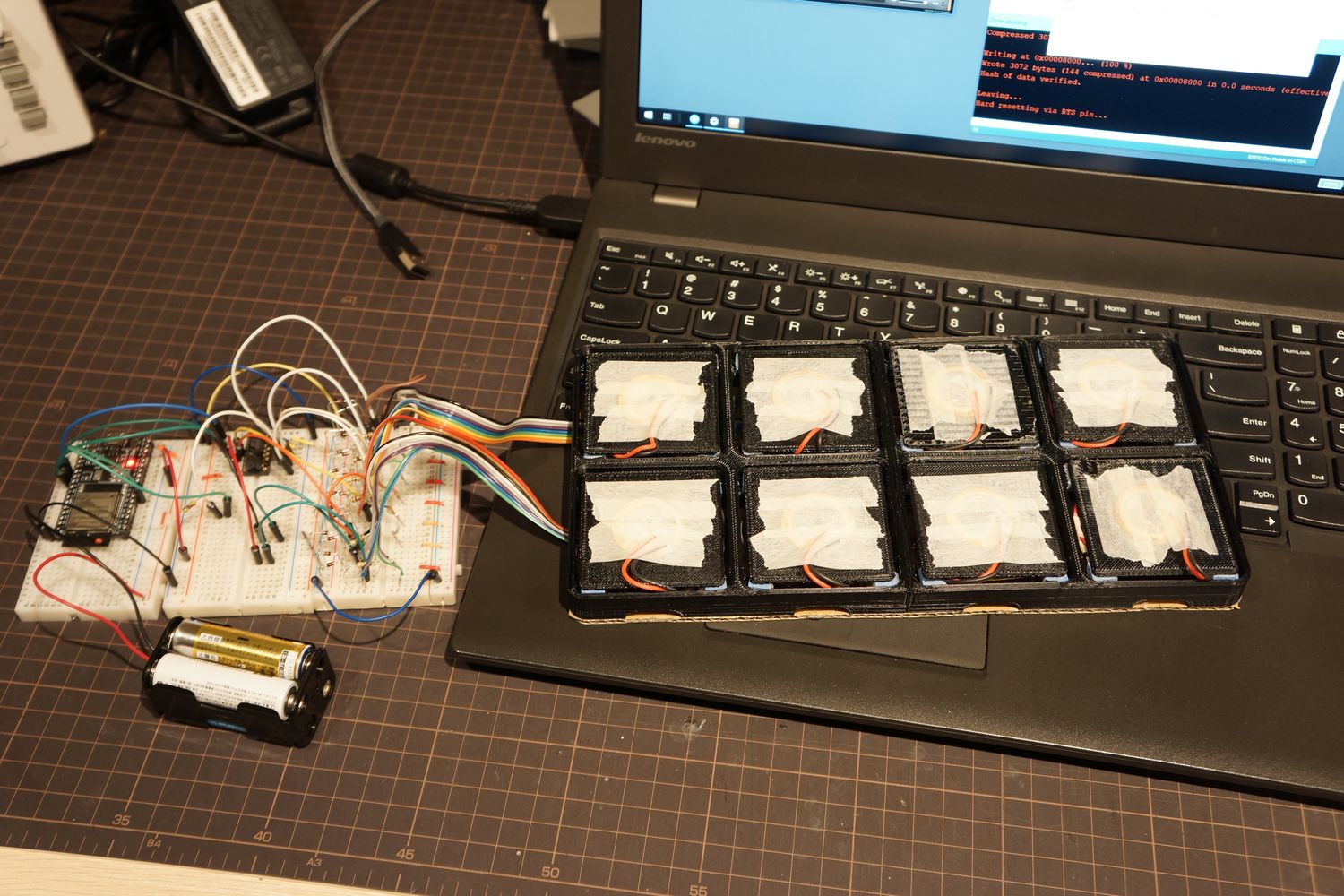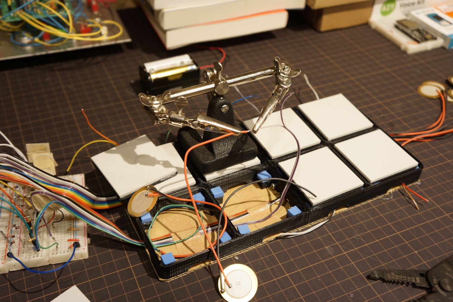 前回はESP32でアナログマルチプレクサを使ってみましたが、小さいブレッドボードに8つのピエゾを繋いでたので叩いて調整するには無理がありました。