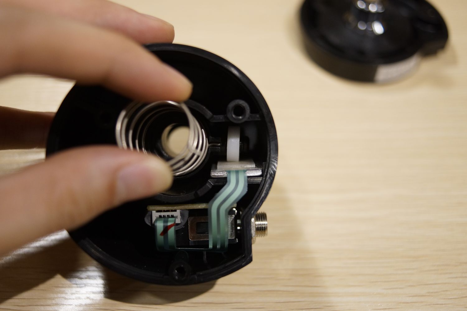 奥に見えるフレキ基板がセンサーです。ちゃんと使ったことはありませんが、FSRと同様で可変抵抗です。センサーの上を手前のパーツに付いている白いローラーが転がることでその位置を検出しています。直接ローラーがセンサーに当たるとセンサーが傷つく恐れがあるのでシリコン?の1mm厚ぐらいのシートが貼ってあります。