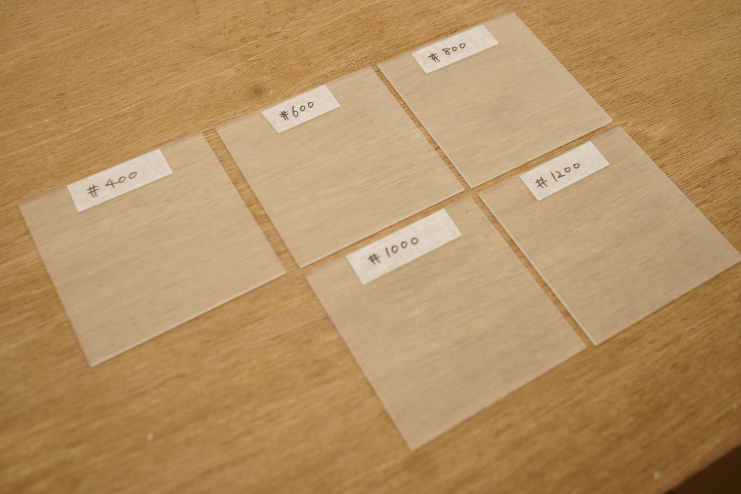 ご覧のように写真では違いがわからない。実際に磨りガラス越しに像を見ないと違いはほとんどない。 #400以下は明らかに粗く、#1200以上は逆に細かすぎて磨りガラスというよりちょっと曇ったガラスという感じになっていく。
