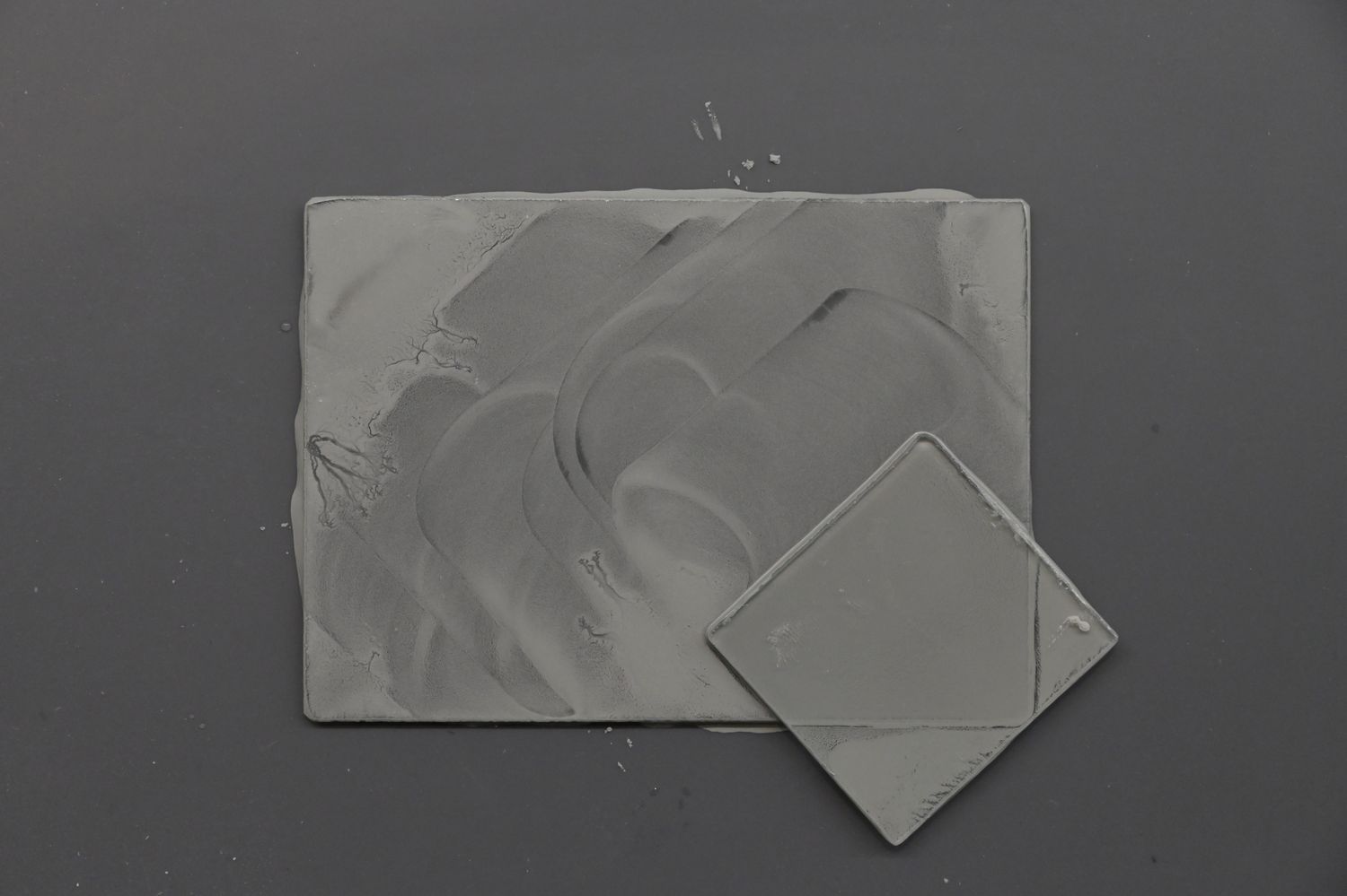 研磨用に使うガラスは指数本で押さえれる40mm角ぐらいの小ささがいい。あまり大きいと磨けてる部分がわかりづらいのでこのぐらいのサイズが使いやすい。意外と腕が疲れるので一度にたくさん作るのは難しいが4x5サイズぐらいだったら15分もあれば出来上がる。